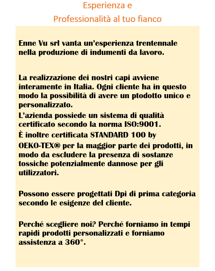 Enne Vu – Confezioni Ilvab offre un contributo professionale per tutte le imprese che hanno l'esigenza di adattare divise e DPI alle esigenze tecniche specifiche e allo stile che meglio di altri valorizza il brand.